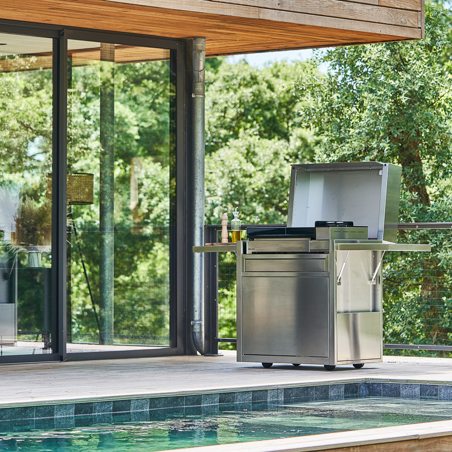High-end gas plancha met een rvs frame, twee onafhankelijke branders en een geëmailleerde gietijzeren bakplaat, geschikt tot 10 personen.