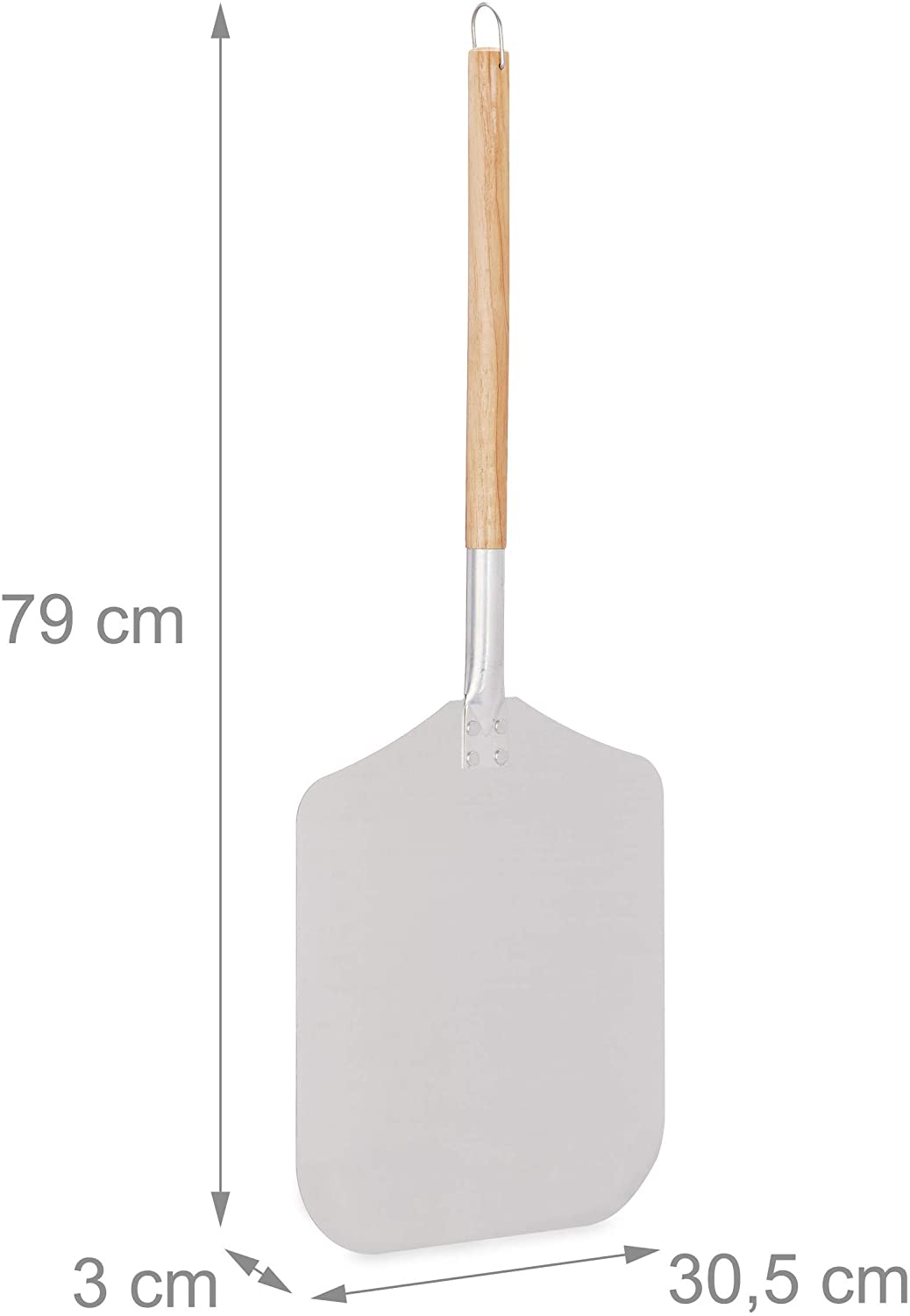 Pizzaschep van aluminum met demontabele houten handvat. Ideaal om grotere pizza’s in en uit de pizzaoven te scheppen.