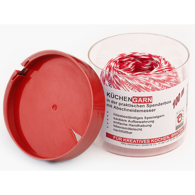 Bind rollades, gevogelte of groenten moeiteloos met dit klassieke rood-witte slagerstouw, verpakt in een handige dispenserbox. De hygiënisch afgesloten box heeft een ingebouwde snijder in de deksel, zodat je het gewenste stuk touw snel en netjes kunt afsnijden, ideaal voor zowel professionele keukens als thuis bij de barbecue.